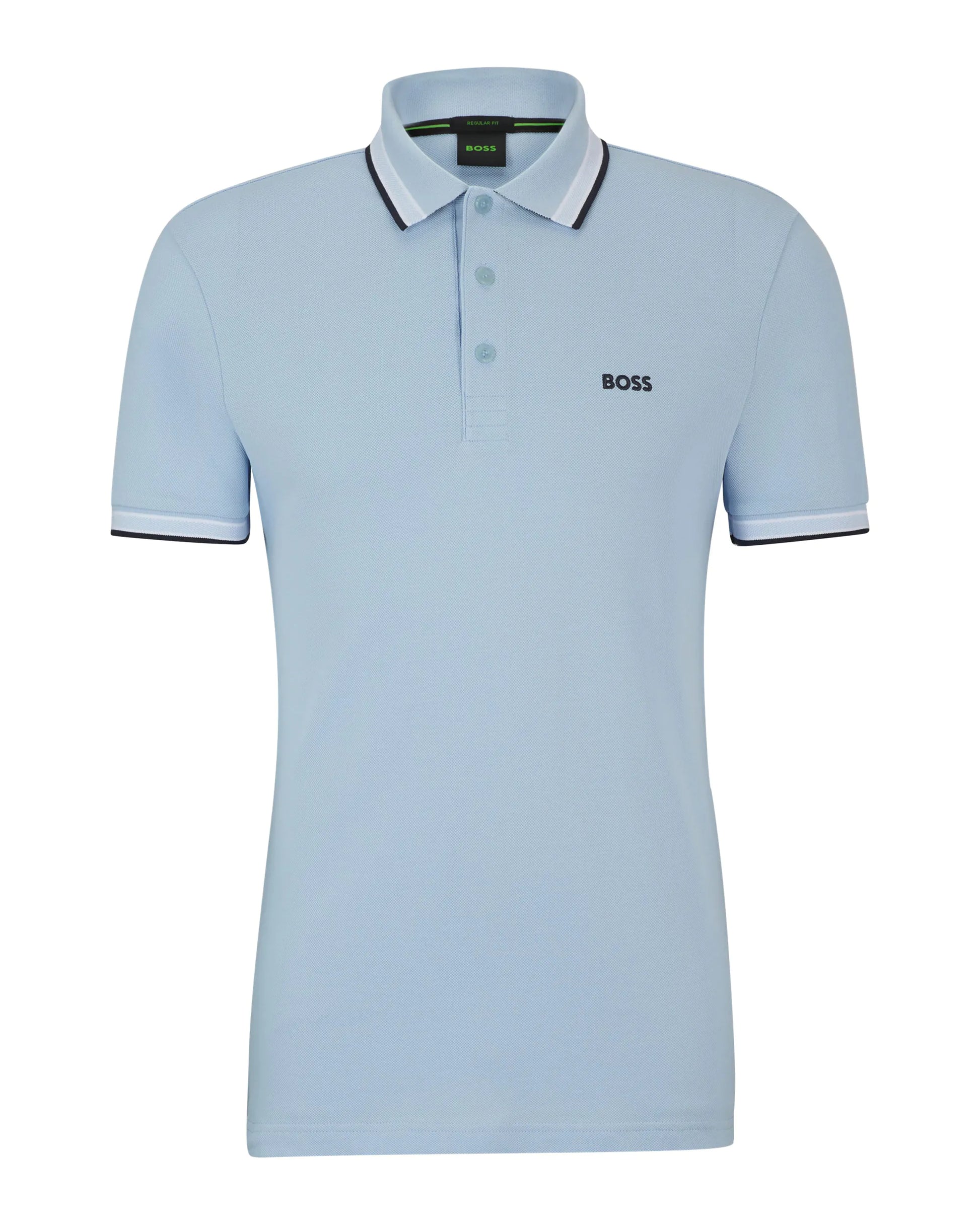 Turn up the collar on this regular-fit polo shirt by BOSS Menswear to reveal logo details. Breathable cotton piqué. Sporty stripes and contrast branding.