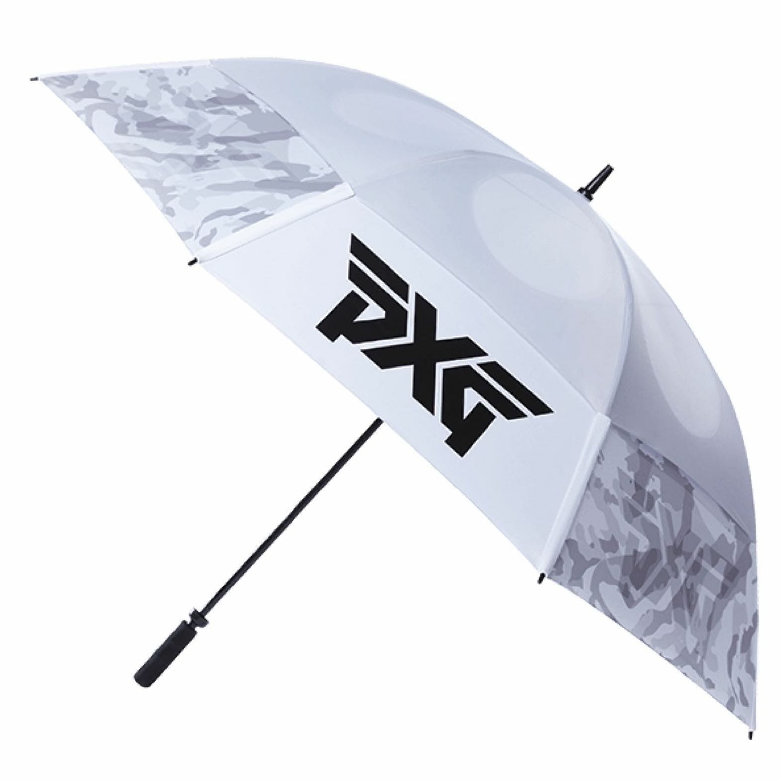 - White camo umbrella with four black PXG logos